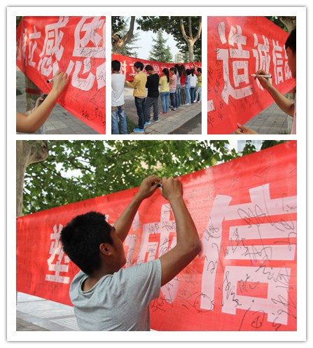 ----土木工程学院资助诚信感恩活动系列报道之一土木工程学院紧紧围绕“塑造诚信品质、树立感恩意识、争做文明大学生”的主题,利用内容丰富,形式多样的展板和QQ、飞信、手机短信等网络资源,进行了大力、广泛的宣传,形成了有广度、有深度的“诚信为本,感恩于心,回报于行”的浓厚活动氛围。5月26日下午四点,在成才大道开展了“励志勤学、诚信感恩”的签名活动,同学们相互交流、积极探讨对“受资助、讲诚信、知感恩”的认识及心得体会,现场气氛热烈。近千名学生争先恐后在横幅上郑重的签上自己的名字,并纷纷表示在以后的学习、生活中将诚信、感恩付诸于行动,学会知恩感恩、诚信做人。