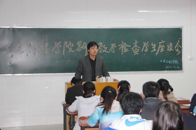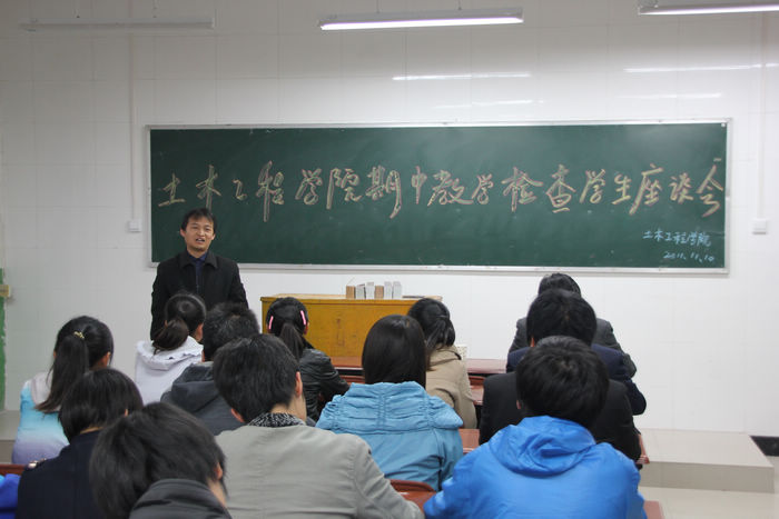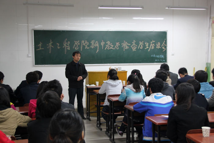根据学院教务处教学工作安排,为规范教学过程管理,促进学院教风、学风建设,土木工程学院于2011年11月10日下午在崇文北楼205、206室召开了期中教学检查学生座谈会。学院党总支书记何克祥、院长贺天柱,教学办主任王涛、学工办主任程建卫和梁黎、夏伟、王丹、来亚兰四位老师及36个班级学生代表参加了此次座谈会。会议由王涛主持。