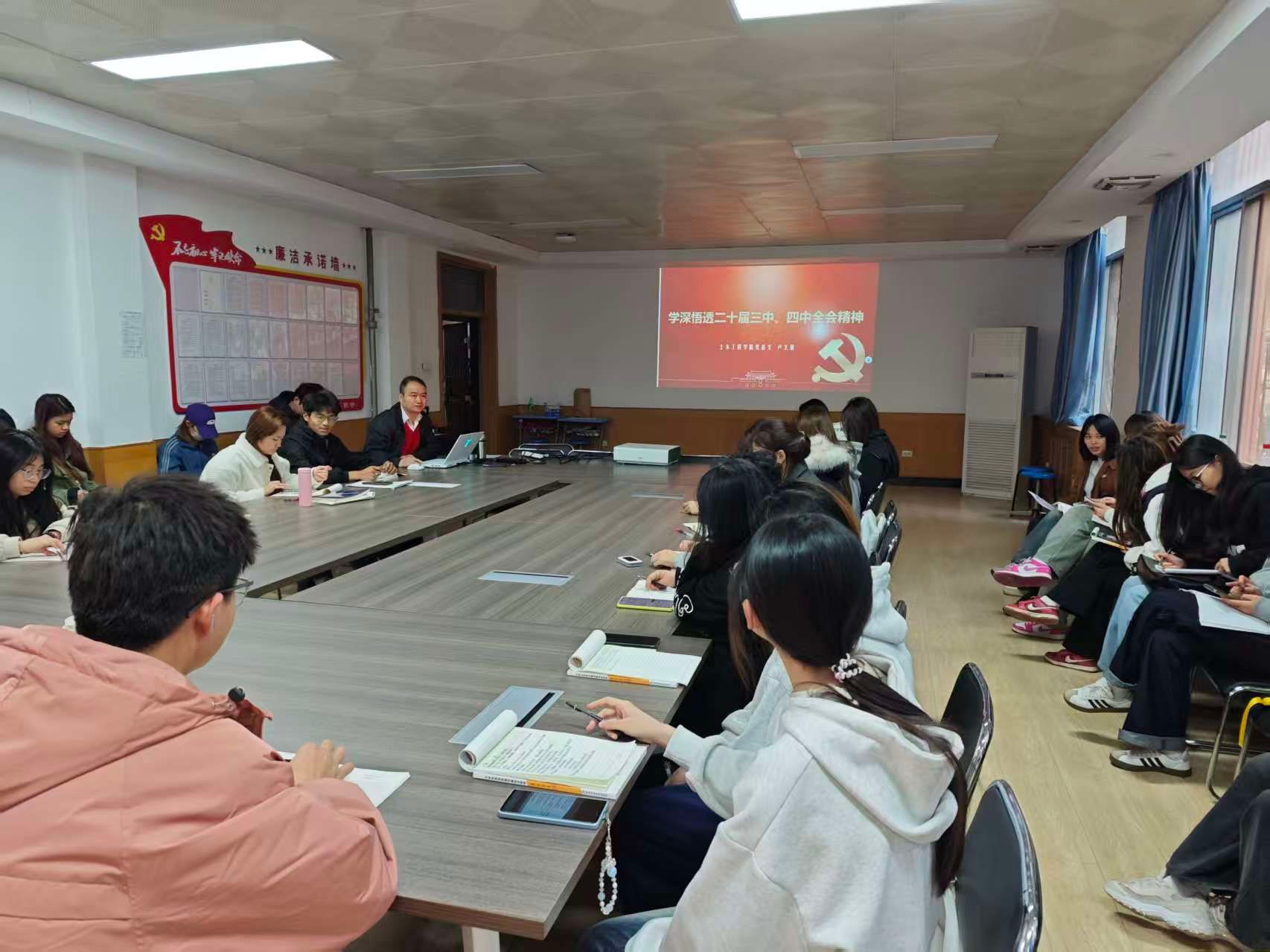 土木工程学院党总支书记卢文澈同志首先介绍了党的二十届四中全会召开的时代背景和重要意义。他指出,这次全会是在全面贯彻落实党的二十大精神、推进中国式现代化建设关键时期召开的一次重要会议,全会审议通过的"十五五"规划建议,为未来五年乃至更长时期的发展擘画了宏伟蓝图。全会高度评价了"十四五"时期我国发展取得的重大成就,这些成就是在应对错综复杂形势、经受重大风险挑战中取得的,充分彰显了中国特色社会主义制度的显著优势。