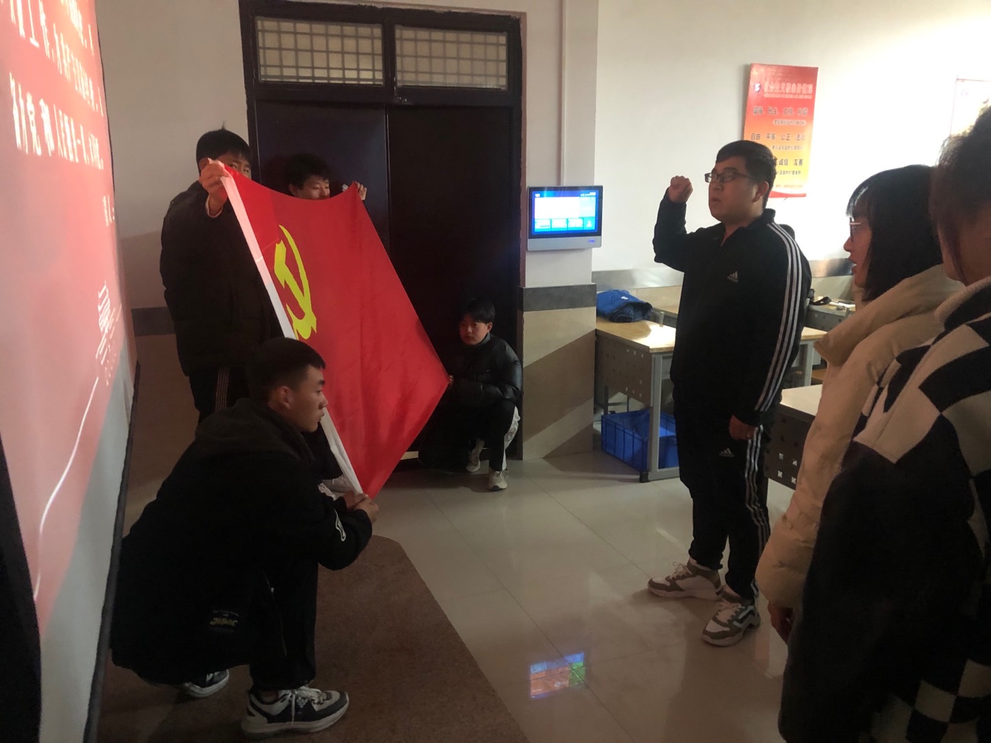 “我志愿加入中国共产党,拥护党的纲领,遵守党的章程,履行党员义务,执行党的决定......”,崇明楼101教室内,土木学生第一党支部组织党员在党支部书记白静的带领下,面向鲜红的党旗重温入党誓词。铮铮誓言回响,在场党员深受感染,更加坚定了对中国共产党的无限忠诚。