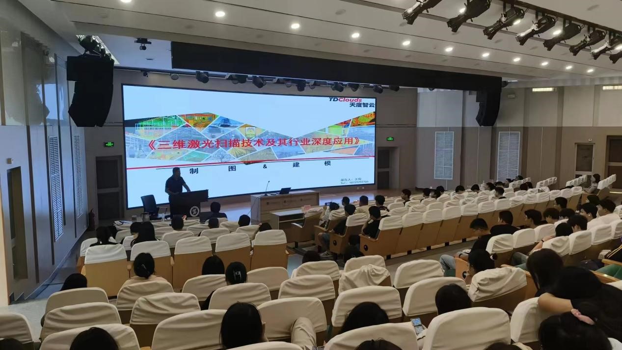 会上,王俊总经理以《三维激光扫描技术及其行业深度应用》为主题,从行业亟需解决的技术难题为切入口,介绍了三维激光扫描技术的发展,从制图和建模两个方面介绍了三维激光扫描技术的行业深度应用。以西安国际足球中心、西安长安书院、深圳体育中心等项目为例讲述了三维激光扫描技术在钢结构辅助安装工程中的应用;并在历史建筑测量、文物数字化、城市改造更新、数字孪生等方面对行业需求进行了深度剖析。最后,王俊总经理对三维激光扫描技术的发展以及测绘地理信息行业与其他行业的深度融合做了展望,并与参会的教师和学生进行了深入的交流。报告会让师生共同感受到三维激光扫描技术广阔的发展空间,同时也展示出地理信息技术的魅力与历史责任。