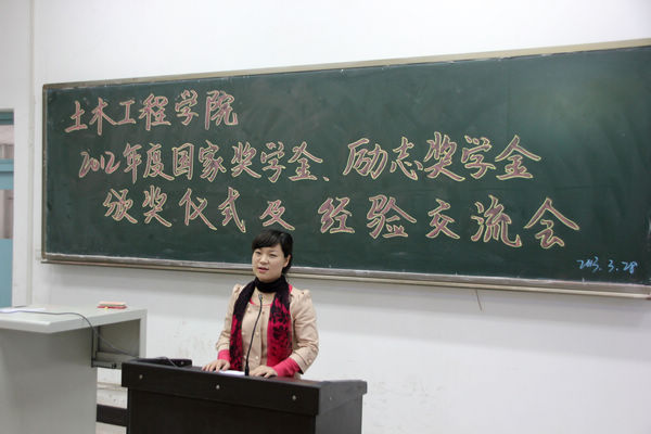 为进一步推动学风建设,鼓励学生成才,营造优良学习环境,土木工程学院于3月28日在崇文西楼104教室隆重召开2012年度国家奖学金发放仪式及学习经验交流会。土木学院党总支书记何克祥、副院长杨谦、院学生资助管理中心主任张艳、魏蕾老师,土木学工办所有辅导员及土木学院59个班级二百余名学生代表参加了大会。会议由学工办辅导员宋群芳老师主持。